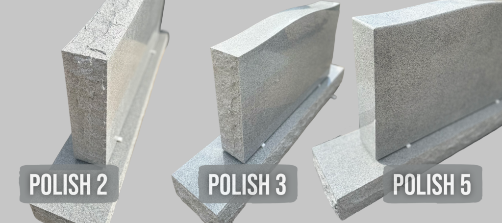 The finish—or polish—of a memorial stone affects both its appearance and how it weathers over time. Common finishes include polished, honed, rock-pitched, and specialized textures used for artistic or custom designs.